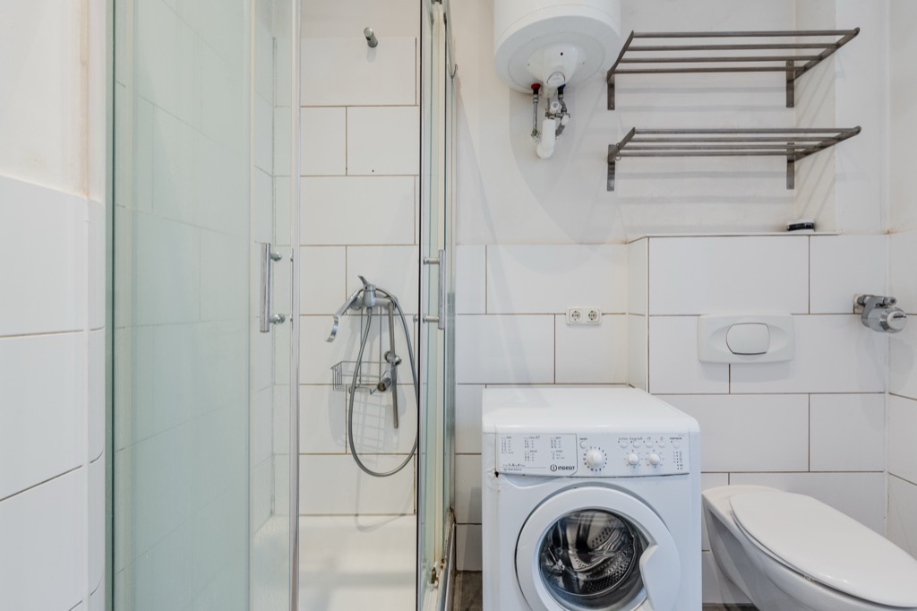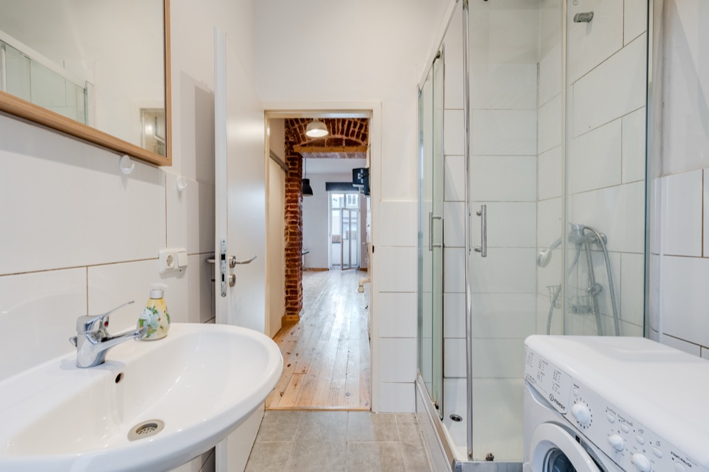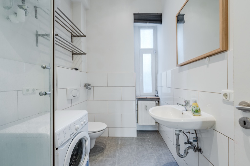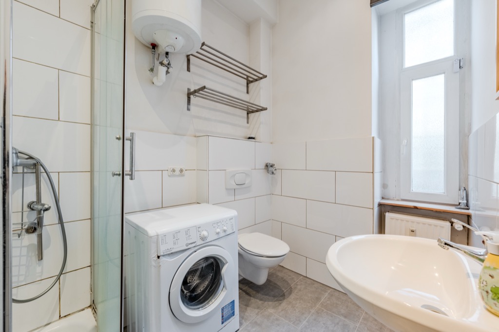 A hallway leads to a bathroom with a daylight window, shower and washing machine connection.