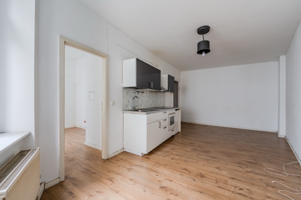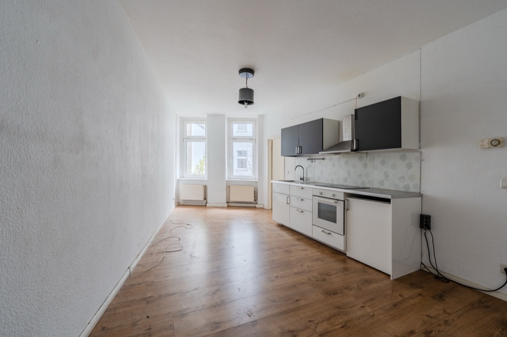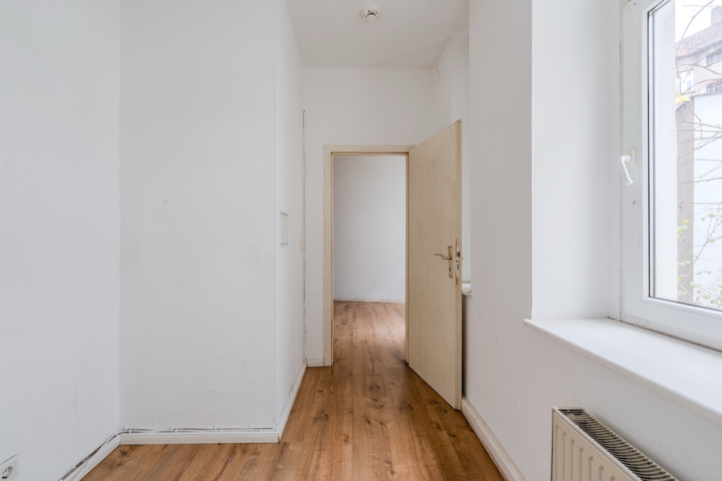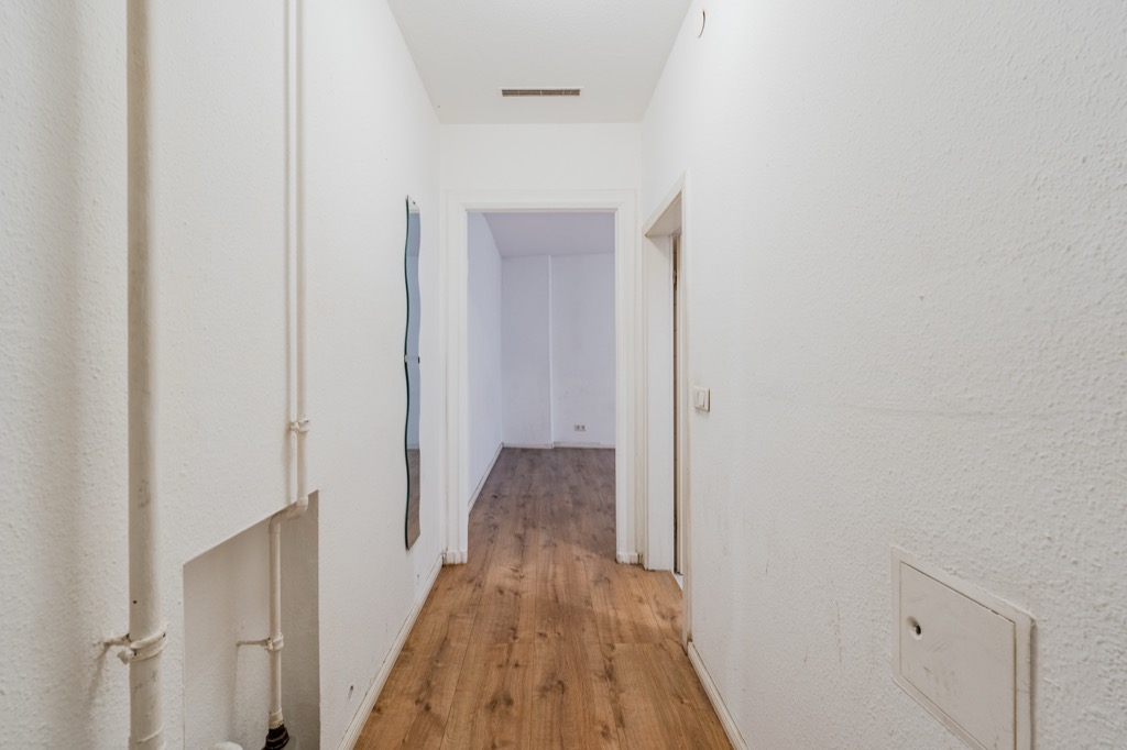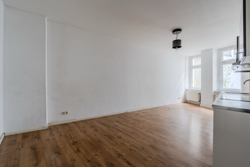 Strategically located just steps from the beloved Boxhagener Platz and Ostkreuz, a magical hub for accessing the entire city and directly to the airport, this small 40m2 one-bedroom apartment is located on the first floor of a building from the turn of the last century. Upon entering, to the right is the large bathroom with bathtub, and opposite the front door is the living room with an open-plan kitchen. The bedroom leads to the small bedroom. The apartment is very quiet as it faces the courtyard and boasts large windows overlooking the tree-lined courtyard.