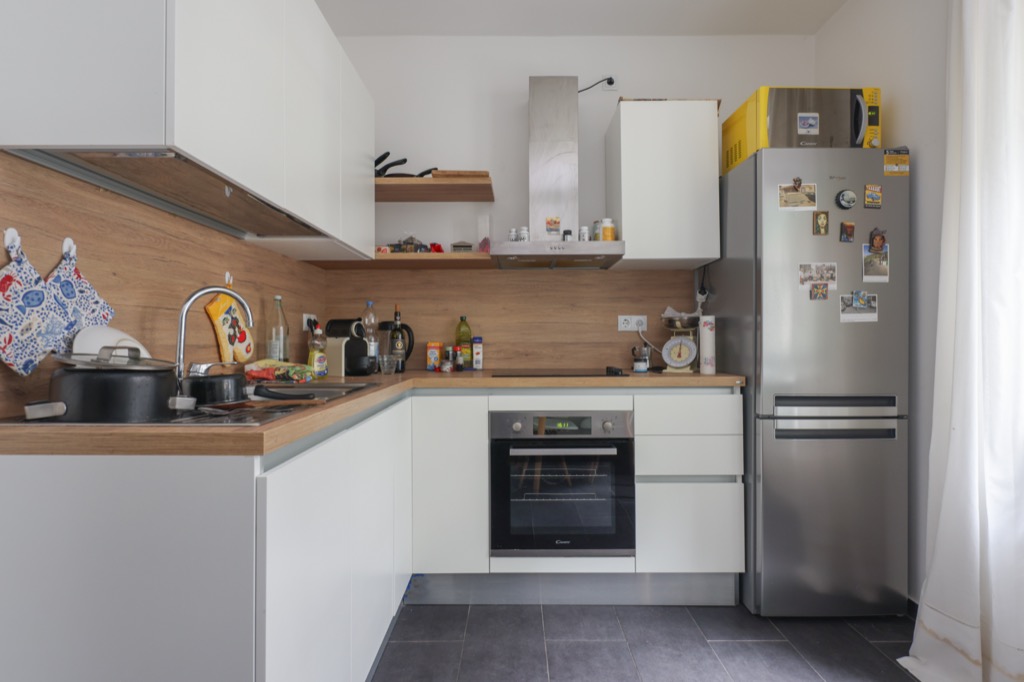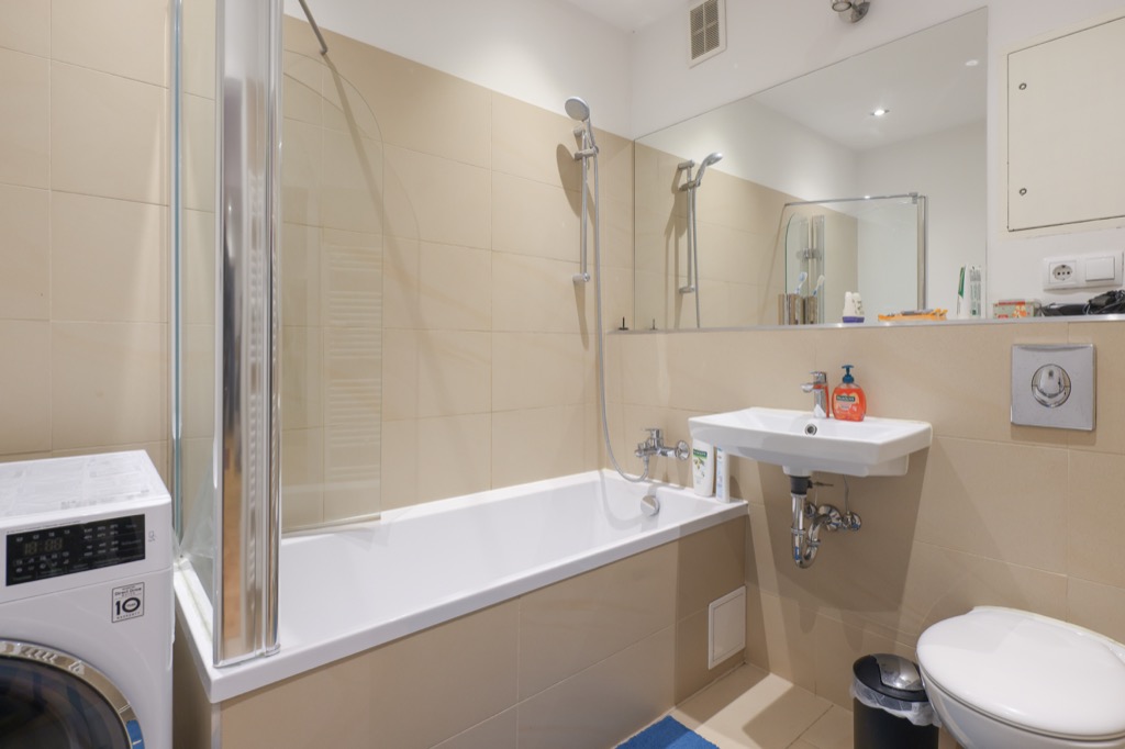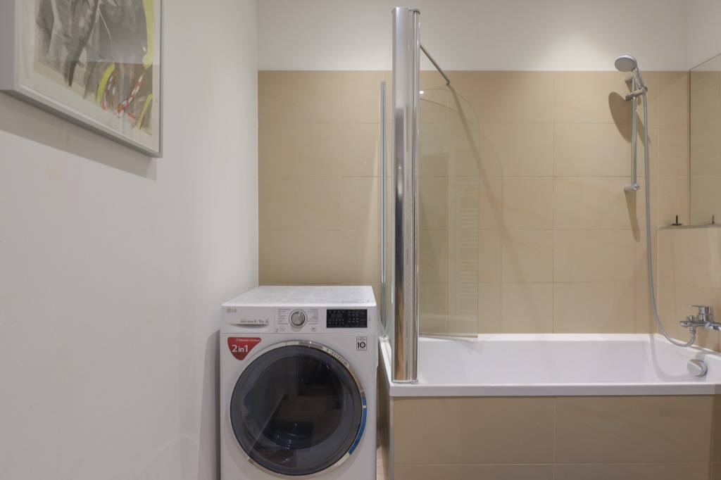 It consists of a beautiful living room with a study corner and a large window that opens onto the spacious balcony, a large bedroom, a perfectly equipped kitchen-living room and a comfortable bathroom with a bathtub and shower where the washing machine is located.