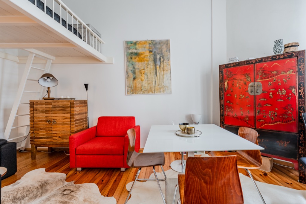 The apartment opens onto a practical entrance and on the right we find the small comfortable bathroom with shower. In the living room, given the height of the ceilings, a large, comfortable mezzanine has been built where an additional double bed can be found to accommodate guests.