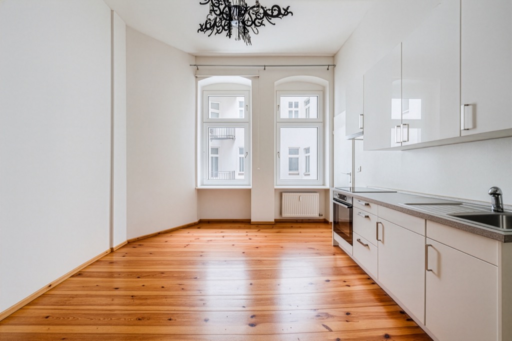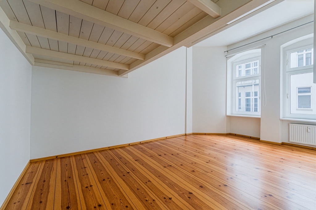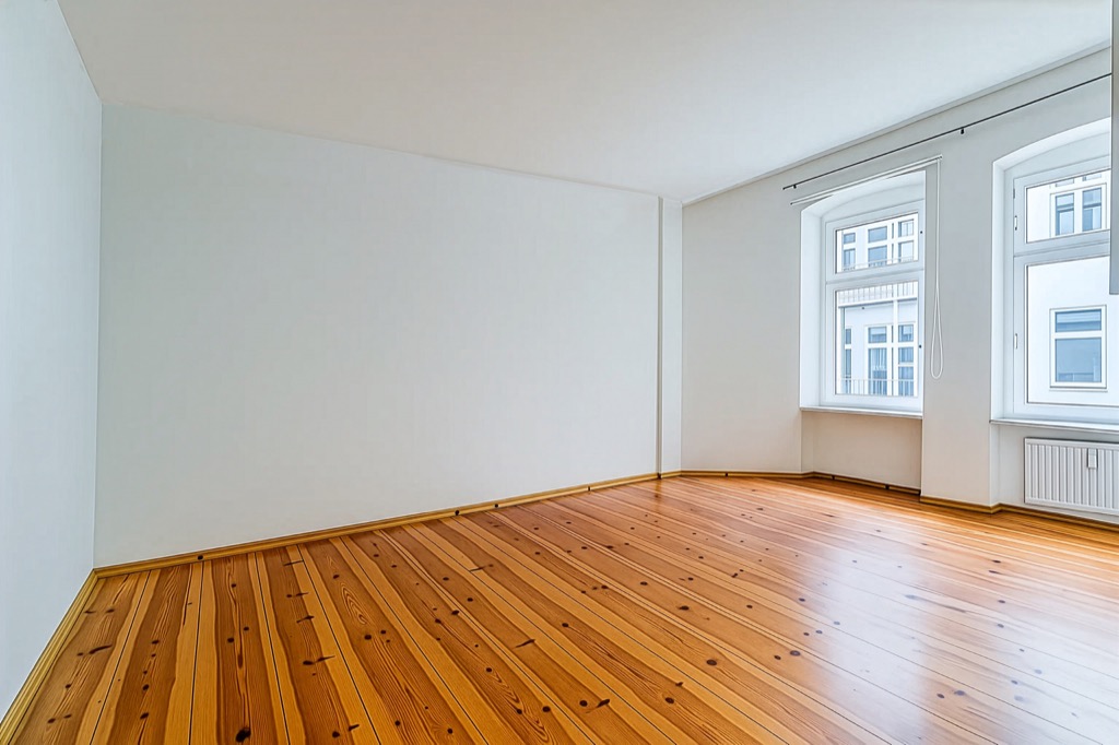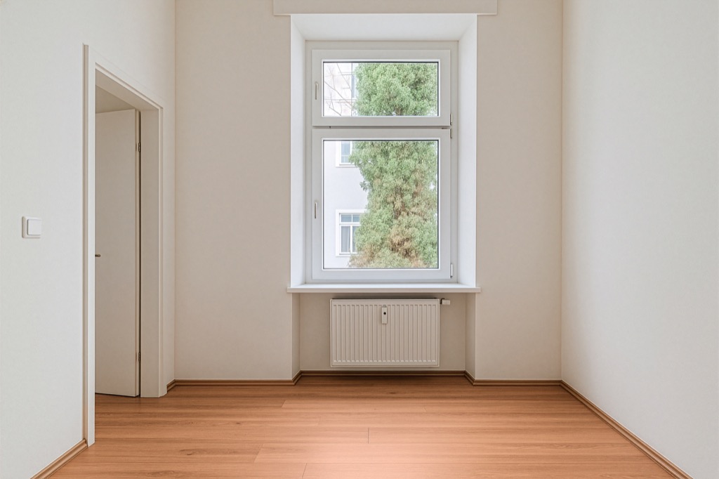 The room is well-lit by two perfectly maintained windows. Next to one of these is the small, cozy bedroom, also with a beautiful, large window.