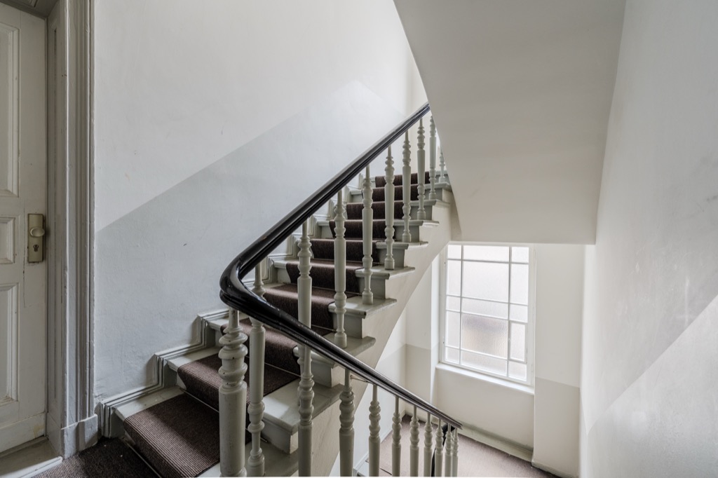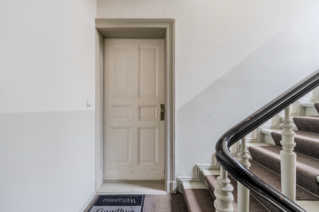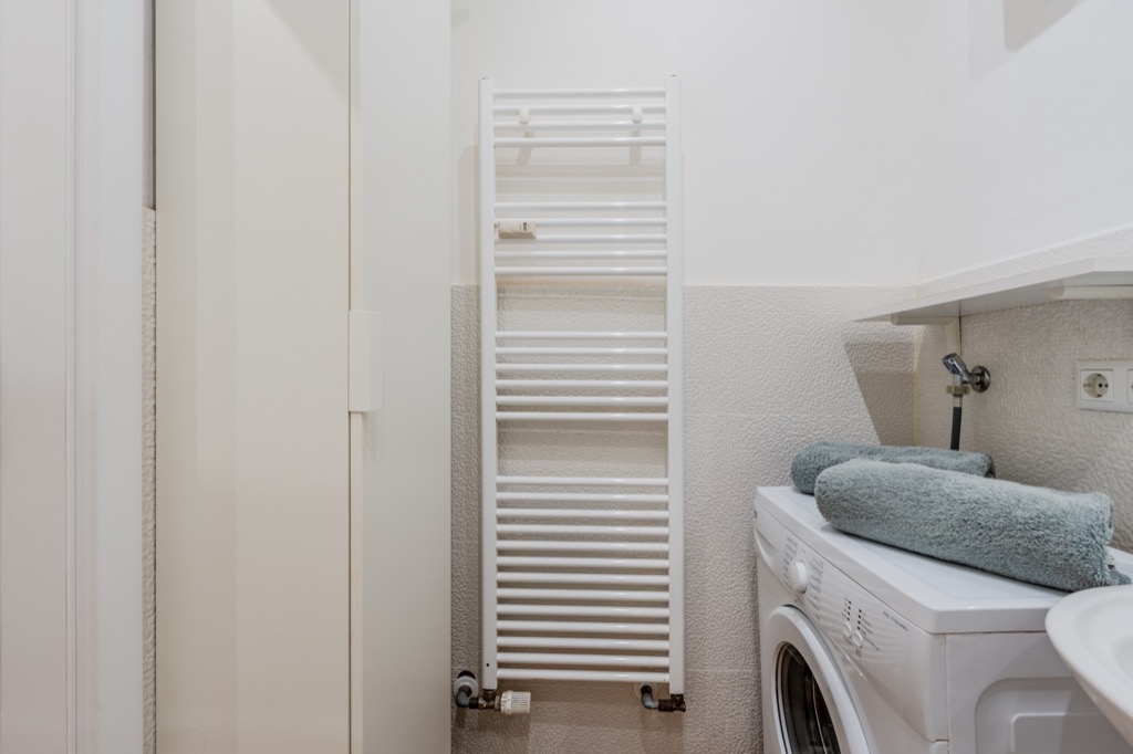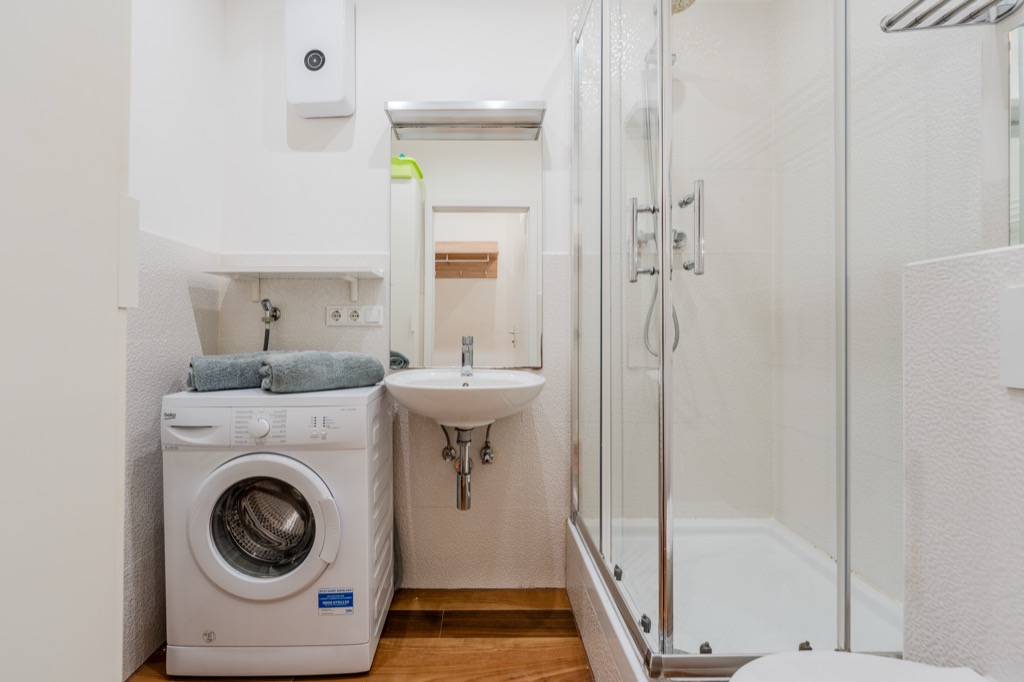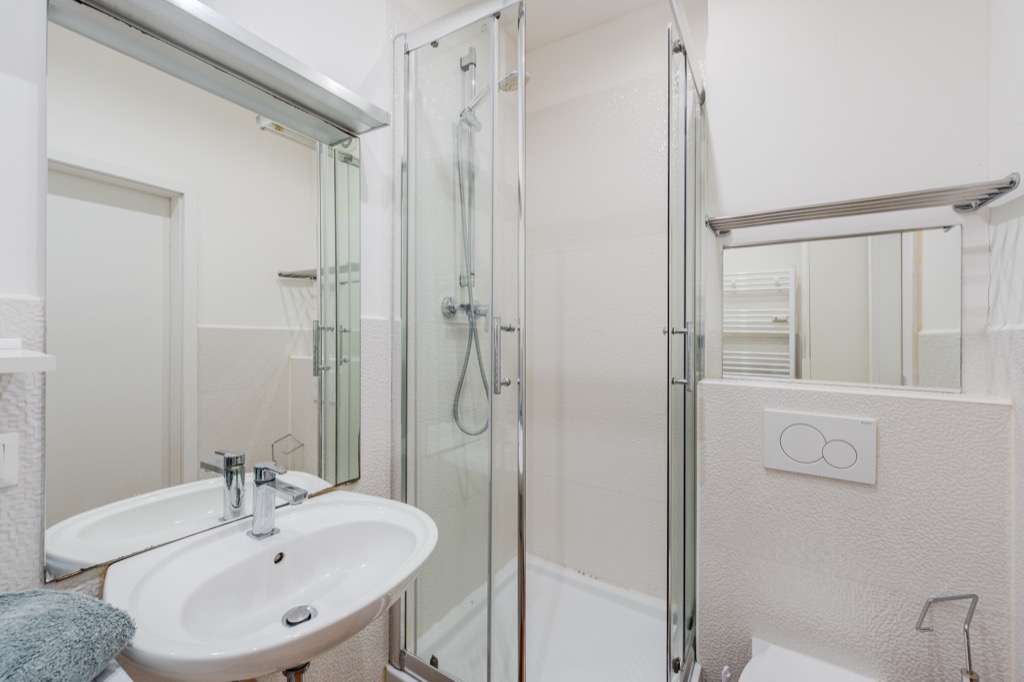 A Studio apartment in a beautiful 1900′ building on the second floor, featuring an entrance hall, a pleasant modern bathroom with shower, home to a washing machine and a heated towel rail, and a living room that opens onto the dining area. A large window illuminates the space. Behind a clever, elegant designer bookcase lies the bedroom with a large, generous wardrobe.