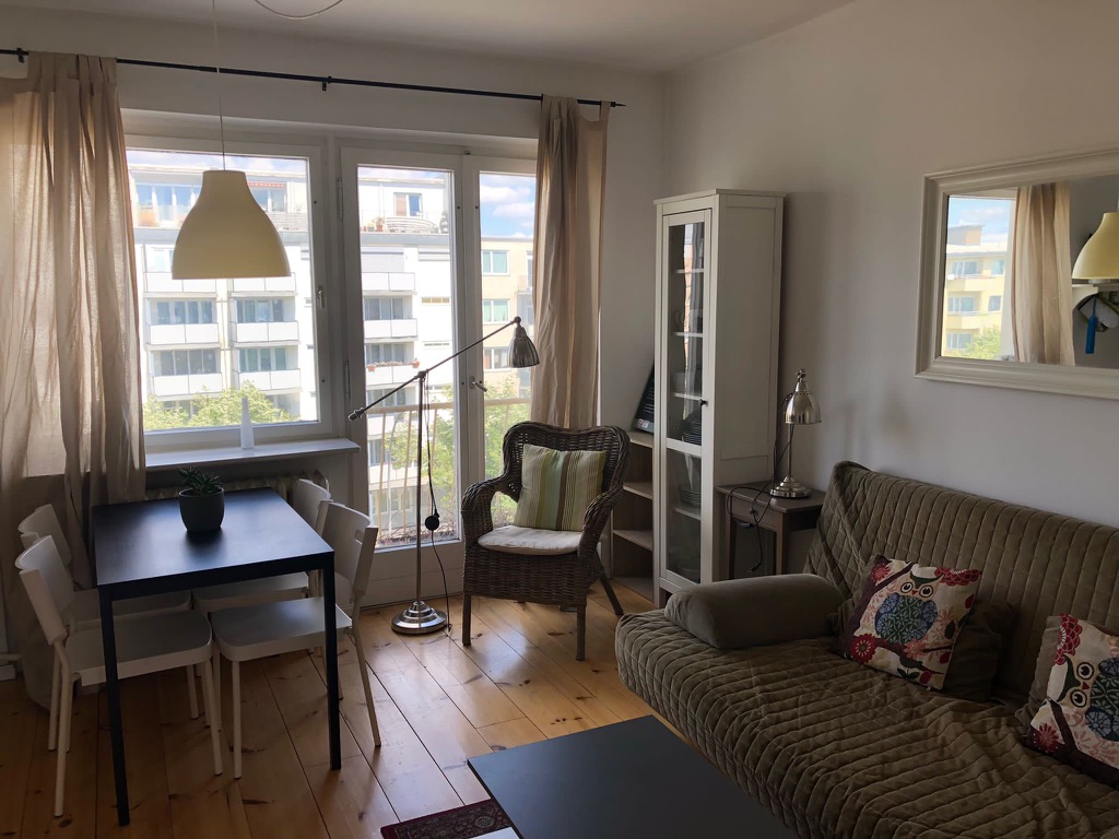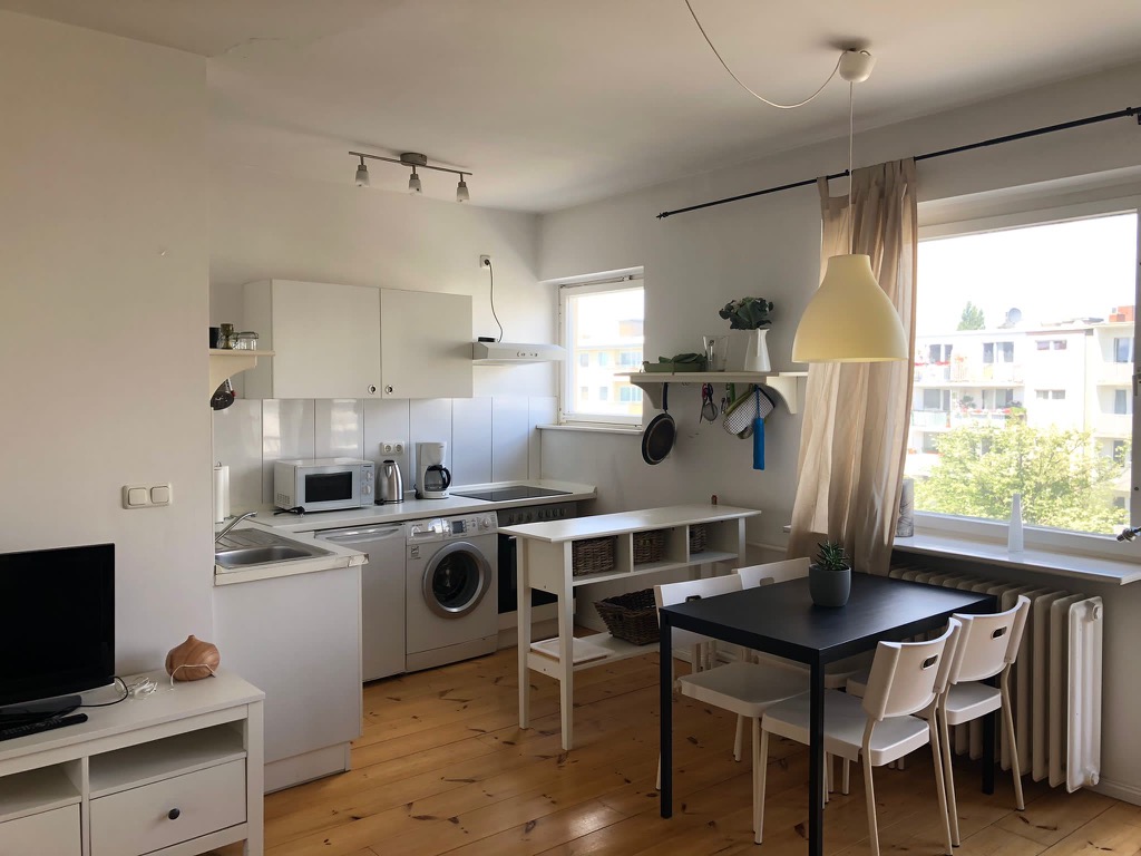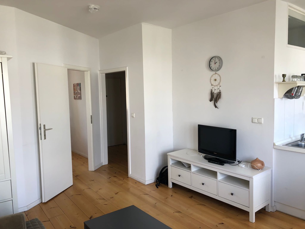 We offer you a 2-room apartment with balcony in Berlin Charlottenburg. The flat consists of an entrance, storage room, bedroom, living room with a fully equipped open kitchen with electronic appliances, a cute balcony and a bathroom with shower. The apartment is also associated with a cellar space and two comfortable storage spaces inside the apartment. One in the entrance and the other on the balcony.