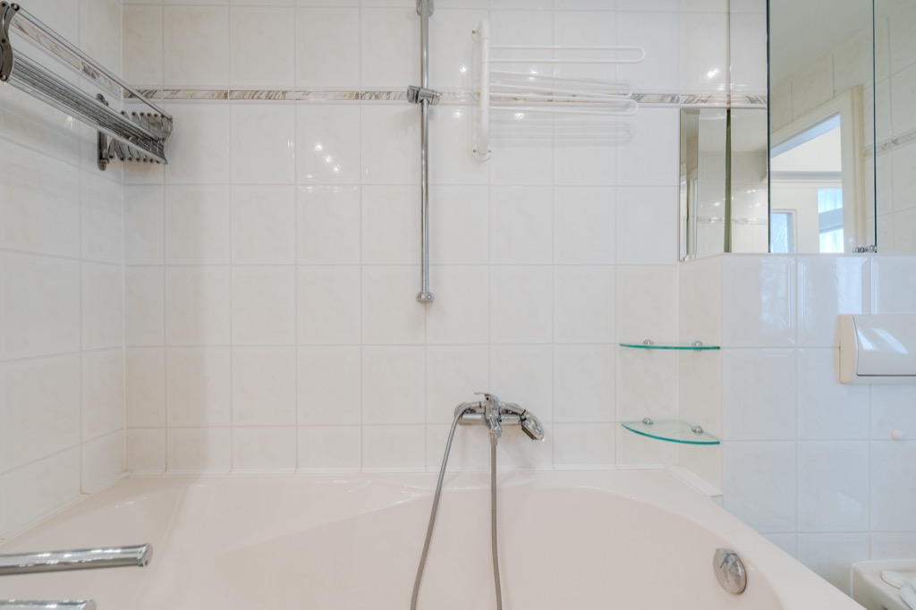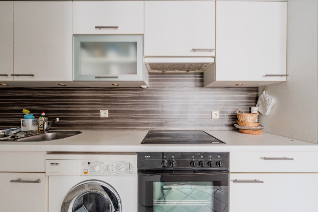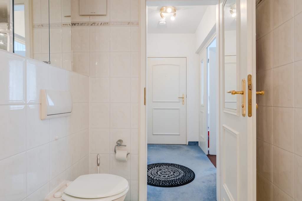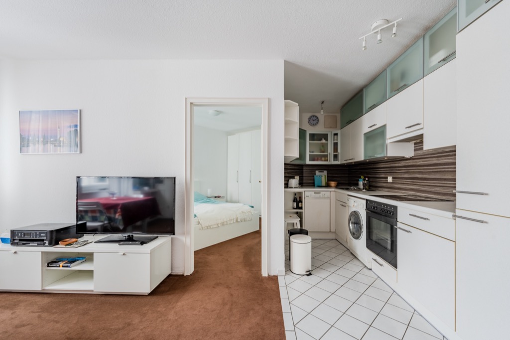 The apartment has a spacious entrance that leads to the inviting bathroom with bathtub and towel warmer. A large glass door opens to the bright living room with a beautiful, perfectly equipped kitchen with dishwasher and washing machine, refrigerator with large freezer, extractor hood, oven and induction hob.