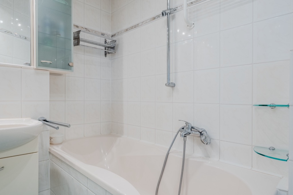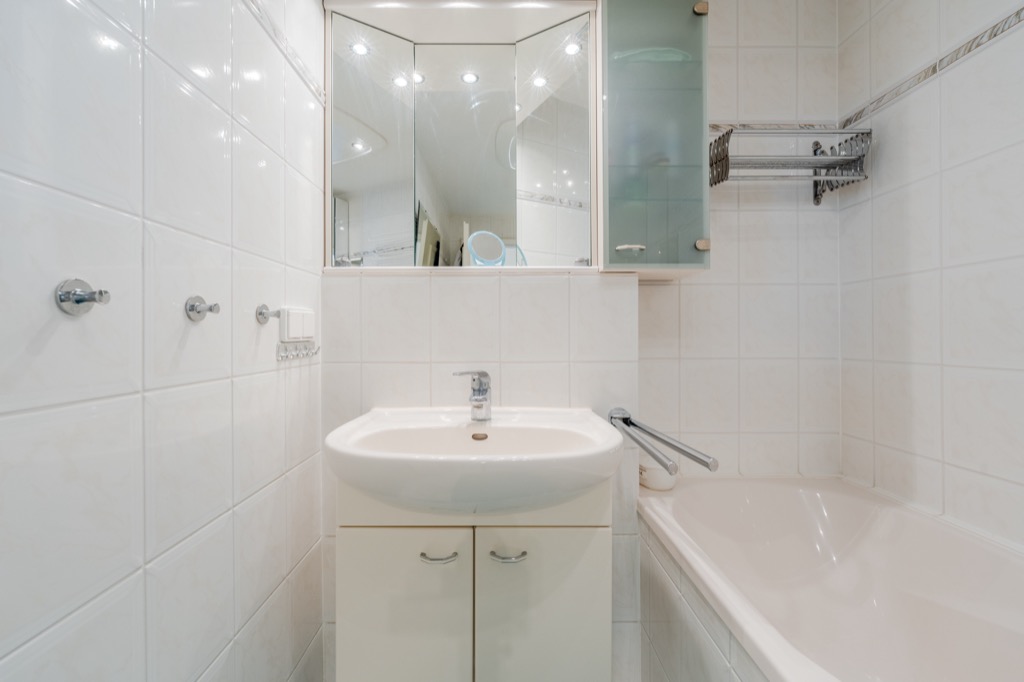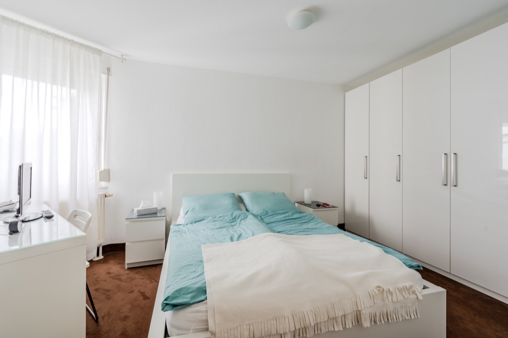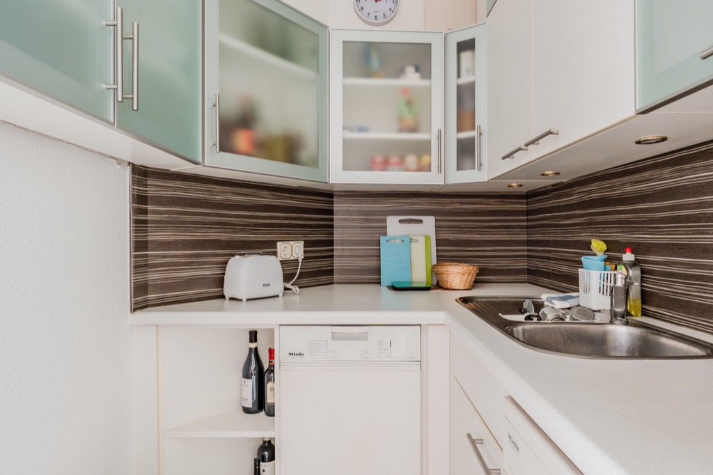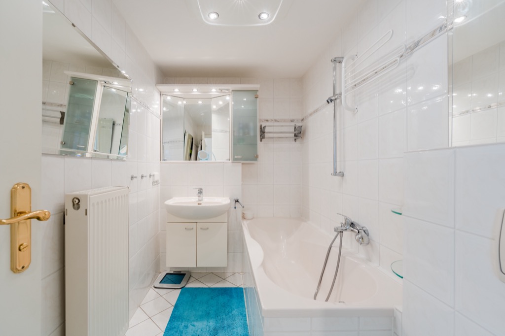 The apartment has a spacious entrance that leads to the inviting bathroom with bathtub and towel warmer. A large glass door opens to the bright living room with a beautiful, perfectly equipped kitchen with dishwasher and washing machine, refrigerator with large freezer, extractor hood, oven and induction hob.