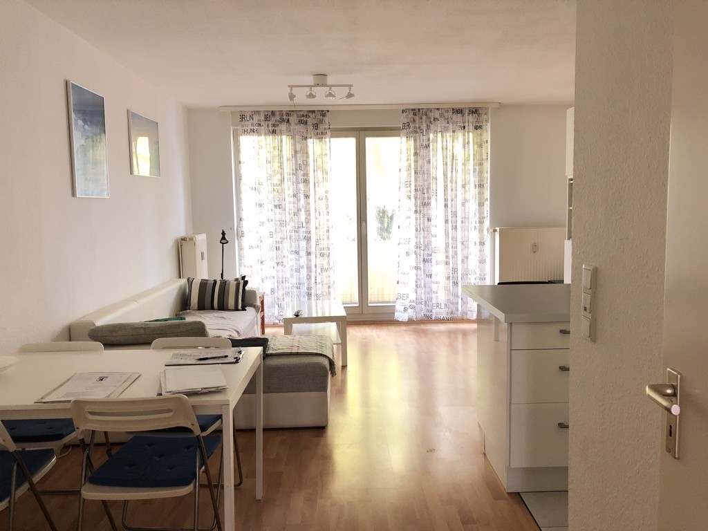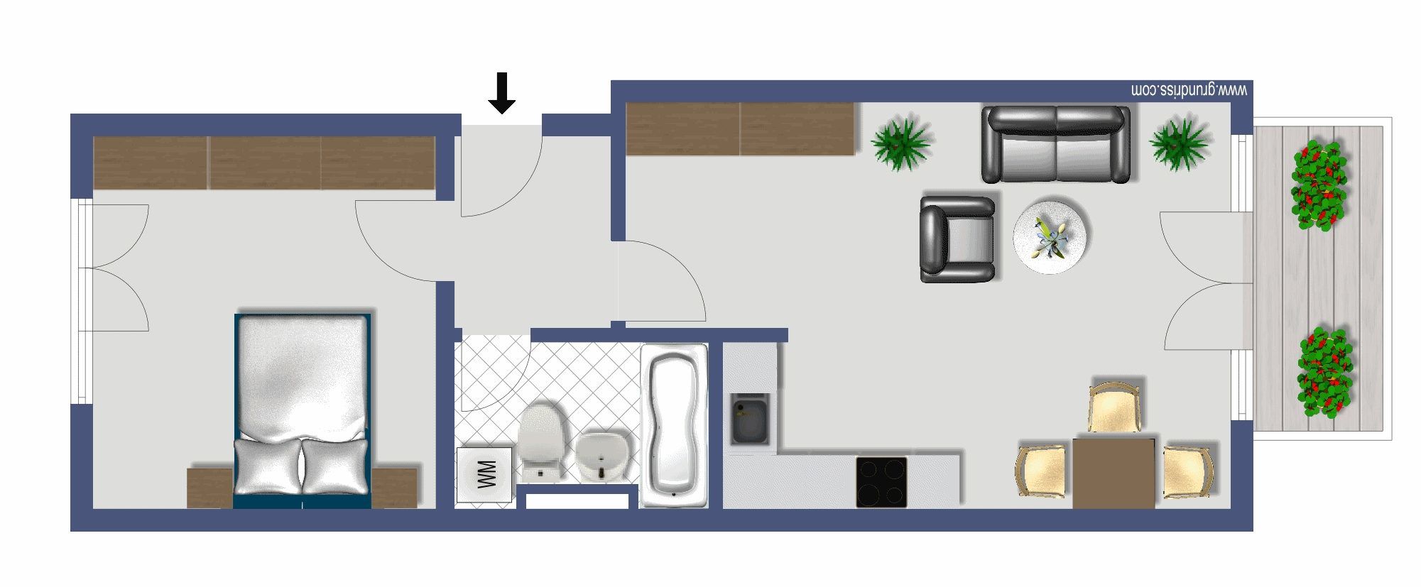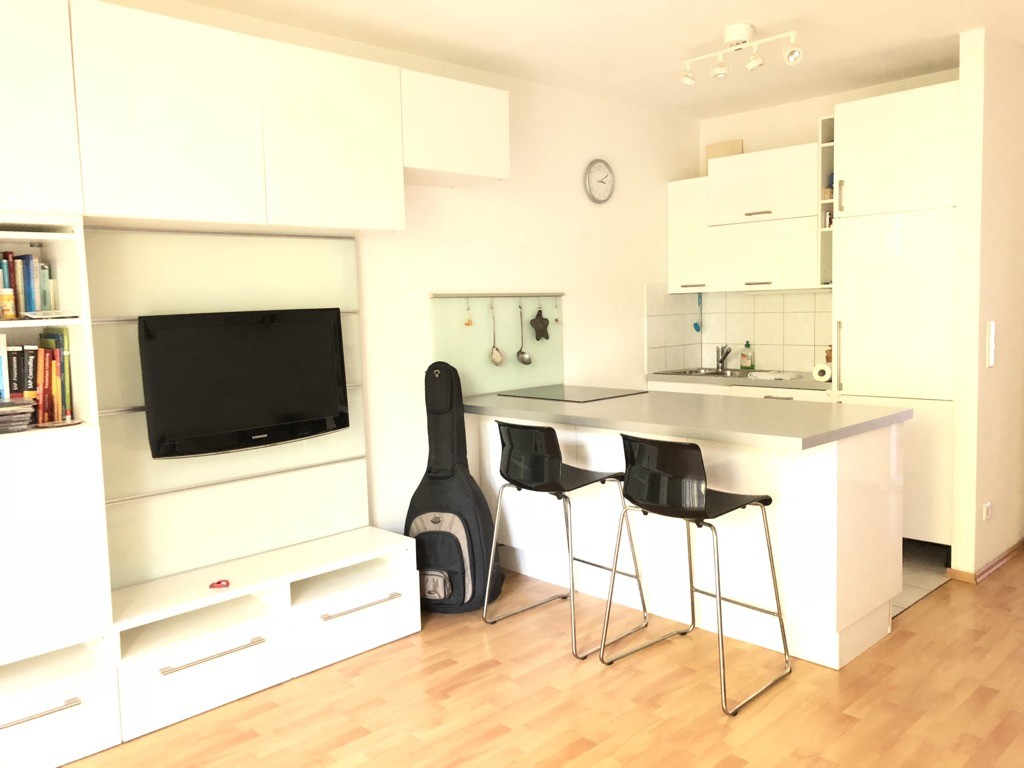 Die Wohnung besteht aus Flur, Schlafzimmer mit französischem Balkon, Bad mit Wanne, Wohnzimmer mit offener Küche und Balkon. Einen Keller ist der Wohnung zugewiesen.