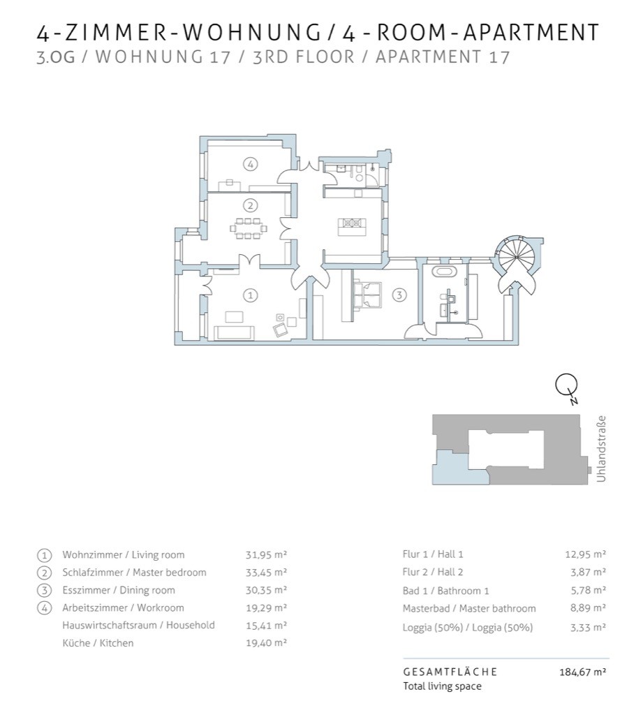 Die weiträumig geschnittenen 3- bis 9-Zimmerwohnungen sind teilweise mit Loggien, Zierbalkonen oder Dachterrassen ausgestattet. Mit etwa 108 bis 310 Quadratmetern und einer Deckenhöhe bis zu vier Meter wird den Wohnungen eine besonders weite und lichte Atmosphäre verliehen. Ergänzt wird die Exklusivität der Wohnungen durch überwiegend original erhaltene Stuckdecken und Holzfußböden. Stilvolle Details wie originale Messing-Türbeschläge und teilweise erhaltenem Ornament-Glas in den Doppelflügel-Kassettentüren machen diese Wohnungen zu Glanzstücken. Dank der großen Holz-Doppelkastenfenster strömt viel Licht in die einladenden Räume.