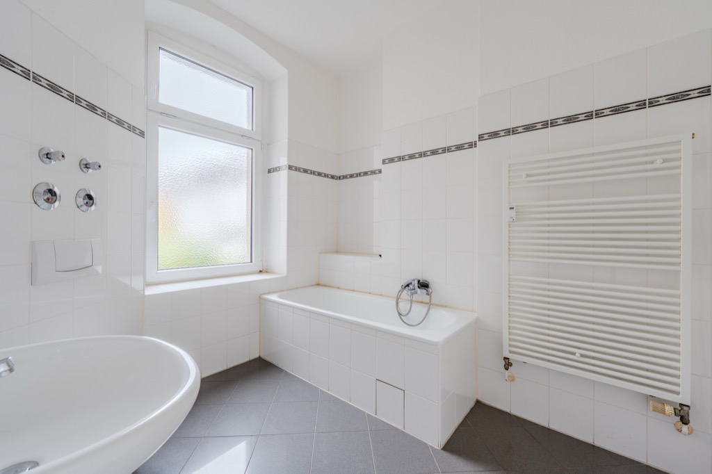 Ein geräumiges Badezimmer mit großem Fenster und Badewanne sorgt für entspannende Momente an schwülen, kühlen Abenden. Die Böden in Küche und Bad sind mit Naturstein gefliest.