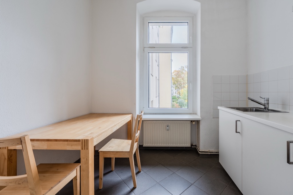 Ein großer Raum mit hohen Decken und Stuck, schöne Holzböden, eine schöne, einladende Küche, deren Holztisch zu geselligen Momenten einlädt. Die Küche ist gut ausgestattet mit Kühlschrank, Backofen und Herd, sauber und einfach, aber dennoch makellos.