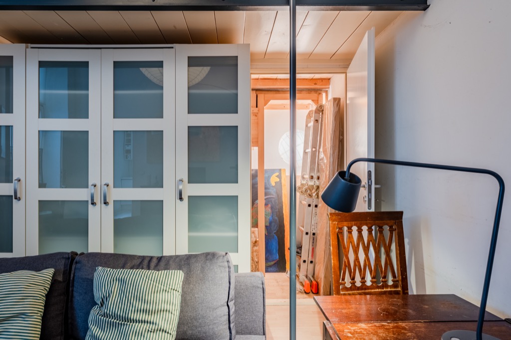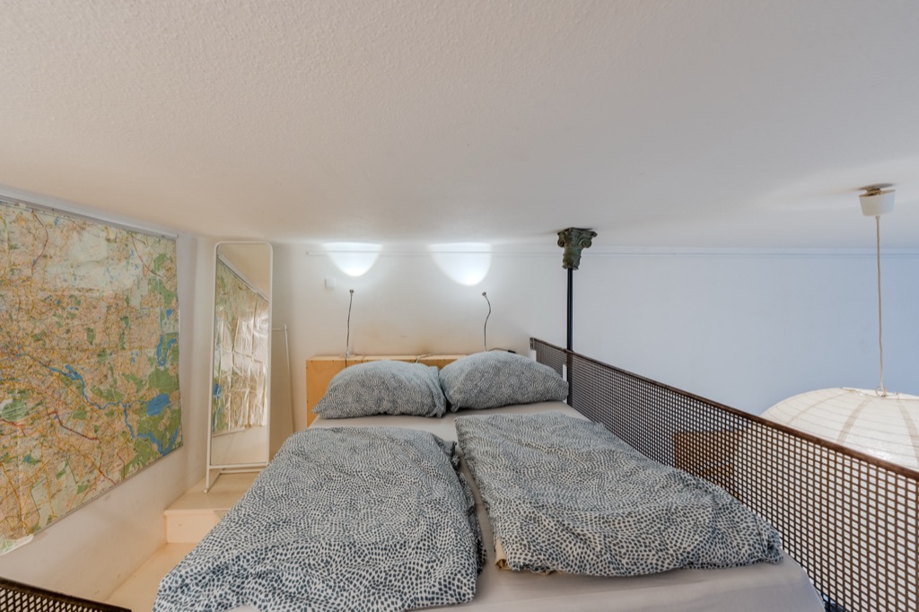 – La zona giorno è sapientemente suddivisa da una solida zona notte soppalcata. La zona notte rialzata sfrutta al meglio l’altezza del soffitto