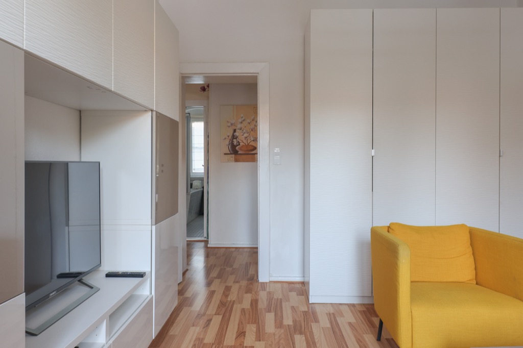 Un bel soggiorno con divano letto, un grande armadio,mobile bar, e parete attrezzata con televisione.