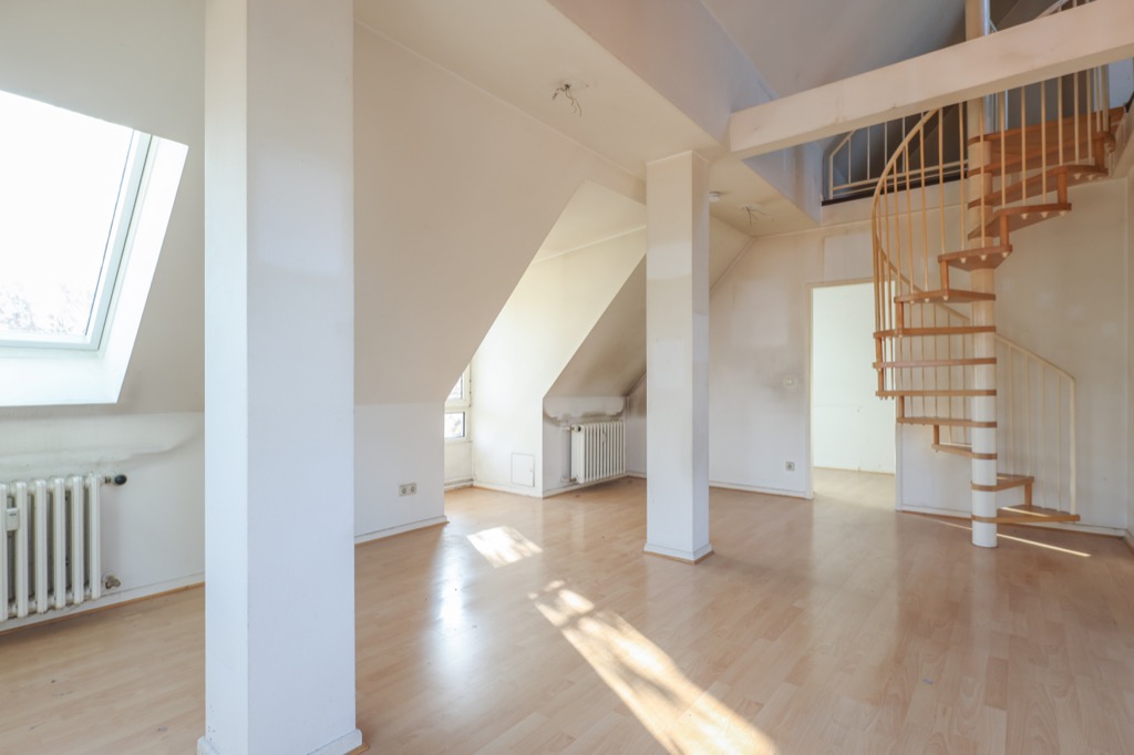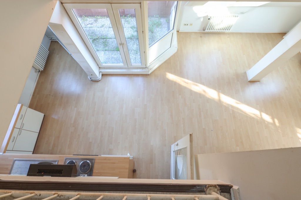 L’appartamento al momento si compone di un ingresso, un grande soggiorno con cucina aperta di quasi 40m2 dove si affaccia il terrazzo con una romaniticissima vista sui tetti,una stanza studio piú piccola uno spazioso bagno con grande finestra e attacco per la lavatrice. Al piano di sopra troviamo la zona notte con ampie finestre.