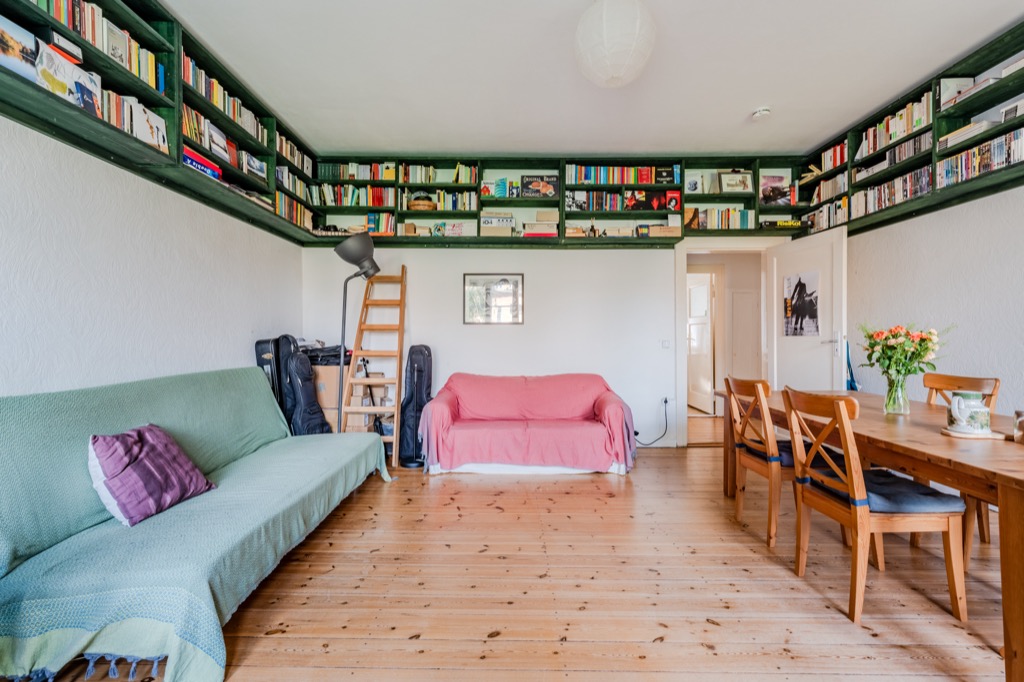 Il punto centrale della stanza è l’incredibile libreria a muro che la circonda. Vero pezzo unico disegnato e realizzato dal padre del proprietario. Una vera bellezza che conferisce una fortissima personalitá all’ambiente.